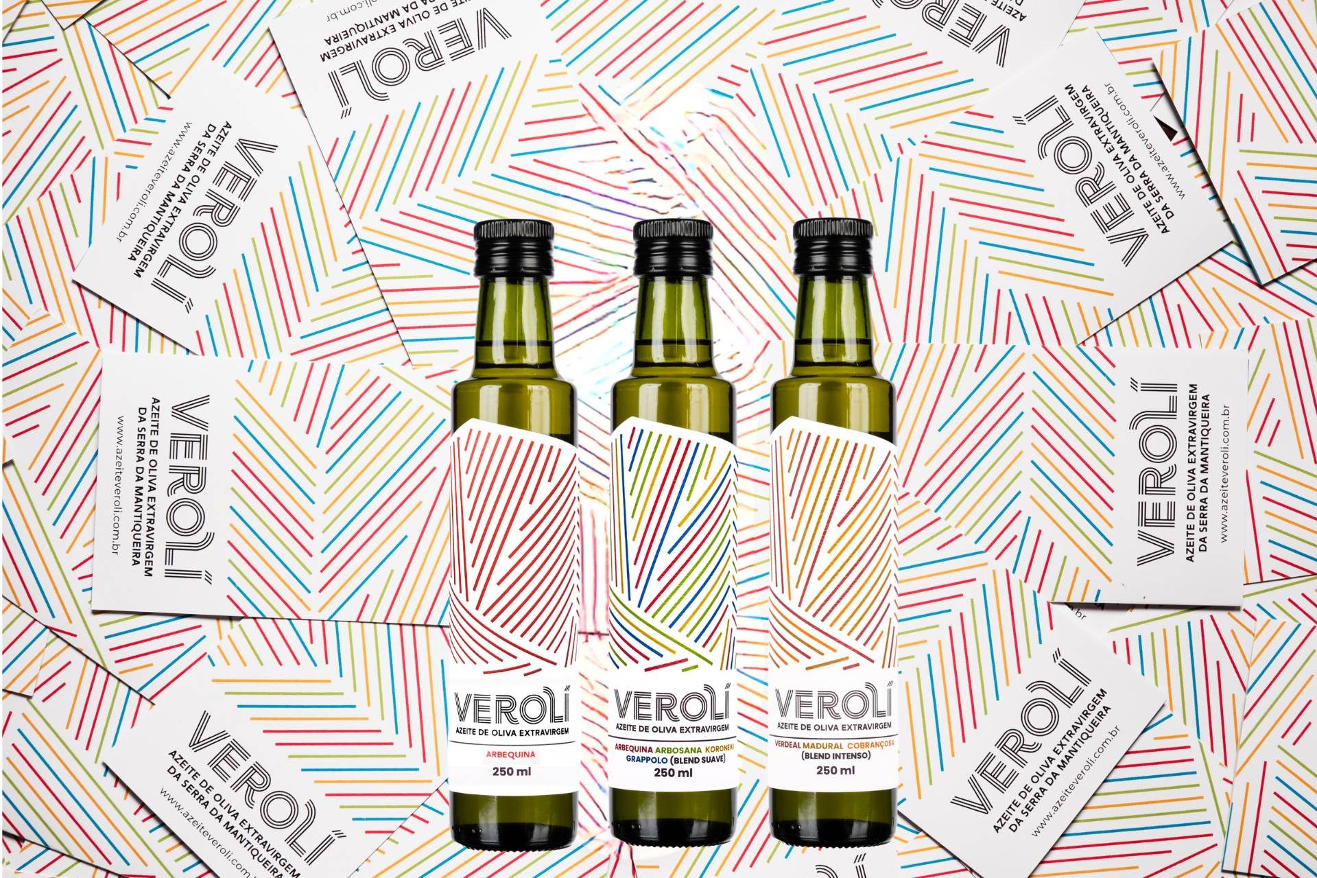 Kit Trio Verolí que inclui 3 azeites de intensidades variadas – 1 Blend Suave, 1 Blend Intenso e 1 Arbequina. Garrafas de 250ml